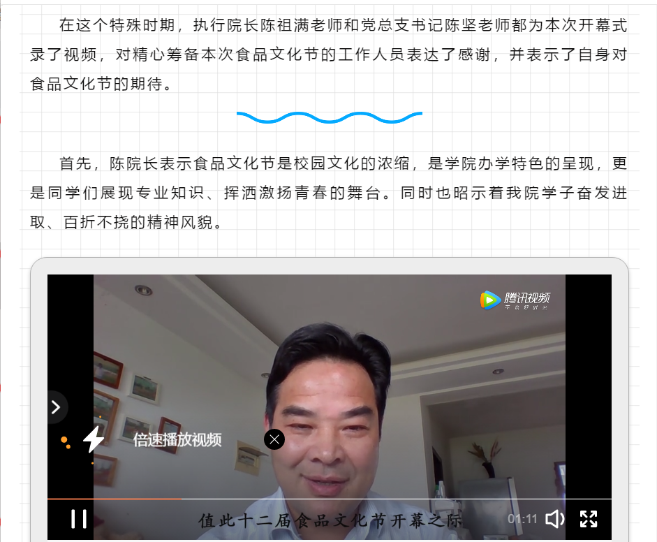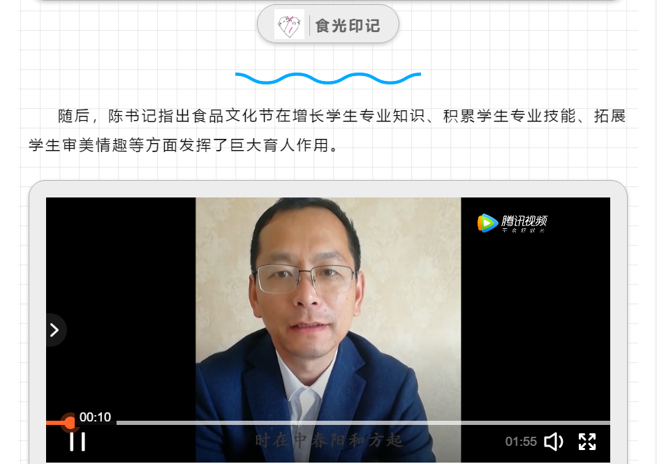 4月18日上午10点,公司“食光印记”公众号正式推文,宣布第十二届“锦时筑梦今朝,共迎食品芳华”食品文化节启动。公司执行经理陈祖满与党总支书记陈坚对本次线上食品文化节高度重视,双双录制了小视频向师生传达心意。两位院领导肯定了长期以来食品文化节在育人工作上起到的积极作用,并表示对本届文化节十分看好。在视频的结尾,两位院领导还向精心筹备本届食品文化节的师生表达了诚挚的谢意与渴望早日相见的真挚期盼。