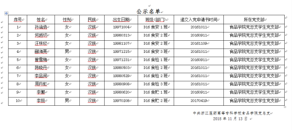根据《中共浙江医药高等专科公司委员会发展党员工作实施细则》的有关规定,决定将拟发展为中共预备党员的10名同志予以公示,公开征求意见。现就有关事项通告如下: