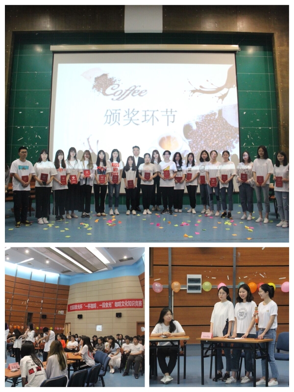 本次比赛以小组形式进行。比赛共分为先声夺人、分秒必争、正面交锋、背水一战四个环节,每个环节都考验着选手储备的知识量和反应能力。第一个环节,各个小组都不甘落后,正答率极高,表现得十分出色。第二环节是抢答环节,抢答环节是以游戏获胜的方式进行抢答,游戏包括转圈抢话筒、吃柠檬读绕口令、抖便利贴、吃奥利奥,这种抢答方式让大家在轻松快乐的氛围中学习了咖啡文化知识。每位选手也纷纷积极投入其中,密切配合。随后主持人邀请了老师和观众一起互动,现场气氛十分热烈。第三环节正面交锋,六组抽签,以一对一的方式进行PK,这使比赛更为公正公平。选手们以咖啡知识论高下,展现了他们各自的风采。紧接着比赛进入最后的环节――背水一战,各个小组使出浑身解数,迸发出独特的智慧,最终Suncoffee组凭借着丰富的咖啡知识,后来居上以67分荣获此次比赛一等奖,皮皮虾组和第一组获得了二等奖,喵喵喵组、打酱油组、豆小豆组获得了三等奖。