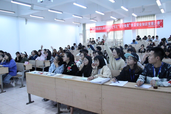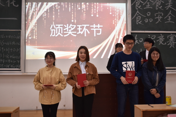 此次食品安全知识竞赛活动于4月10日启动,经过初赛的笔试选拔,其中有30位选手脱颖而出。在决赛中,选手们分成5人一组共计6组的决赛队伍,决赛分为4个环节,分别抢答题、必答题、情景模拟题和生死题。抢答题由各组的代表选手进行举手抢答,累积得分。必答题以及情景模拟题由现场抽签决定题目,考验团队之间的合作能力、选手的想象力以及理解能力。各个环节都表现了团队之间的默契及临场应对能力,期间的情景模拟题选手们生动的表演更是赢得了观众们的阵阵掌声。最后冯椰媛等人组成的“吃浪味仙”队荣获第一,孙婕等人组成的“五脸懵逼”队获得第二,梁梦涵等人组成的“超凡小组”获得第三。
