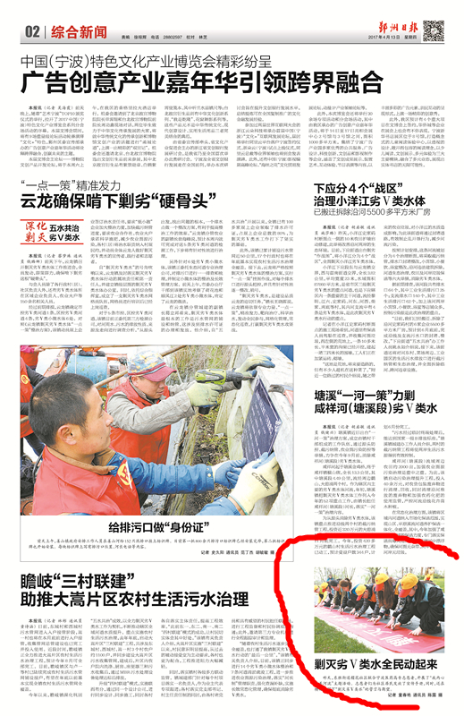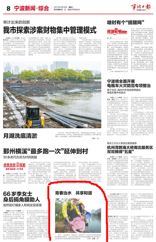 本次英国365集团团委员工会先锋青年携手樱花社区“剿灭劣V类水,我们在行动”志愿活动得到了4月12日宁波日报,4月12日、13日鄞州日报和4月13日“鄞州发布”微信公众平台的共同报道,得到了社会的大力肯定。同时,我们也呼吁广大青年员工积极响应号召,加入到“剿灭劣V类水”行动大军中,争当剿灭劣V类水的宣传者、践行者和监督者。