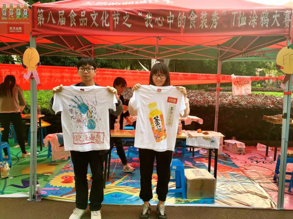 本次T恤涂鸦大赛活动于4月10日开始海选,初赛以给自己喜爱的食品设计精美的外包装美图选拔出进入决赛的选手。其中的12幅创意十足的美图脱颖而出进入决赛。决赛分为三个部分:第一部分由选手们在活动现场进行限时创作;第二部分是为现场投票和微信投票,总票数由主办方统计;第三部分是将在本届食品文化节闭幕式上由模特走秀的形式展现出来。4月28日活动当天在我们色彩斑斓的活动现场,无时无刻不吸引着过路的一大波同学,他们齐齐称赞着我们选手的涂鸦作品各具特色。