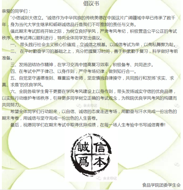 以诚信之我 展优良学风——致全院员工诚信考试倡议书