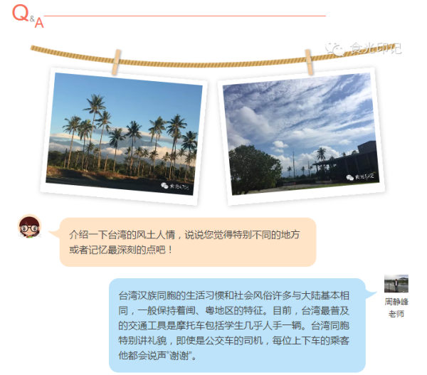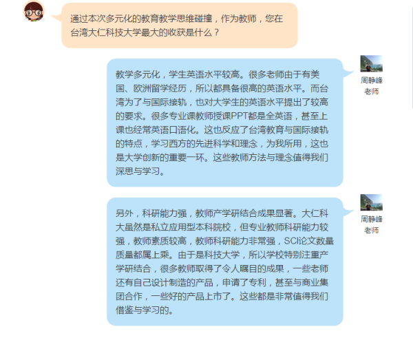 2015年6月25日,台湾大仁科技大学发来一份邀请函,邀请公司4名老师以及61名员工于2015年9月7日至2016年1月15日赴台进行研究教学以及短期研习活动。公司周静峰老师作为青年教师也在其中,并赴台学术交流。眼见归期将近,为了大家能够更了解我们的周静峰老师在台湾的学术交流生活,我们联系到了现处台湾的周老师,就此次短期研习中老师的所获进行了一次网络采访。