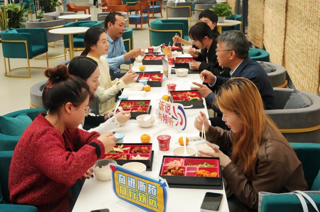 11月9日中午,奉化校区餐厅内洋溢着温馨与暖意。党委委员、副董事长沈忠华在公司党委书记陈坚、副书记吴锦、辅导员许波的陪同下,和结对寝室员工围坐在一起,共享美好“食”光。