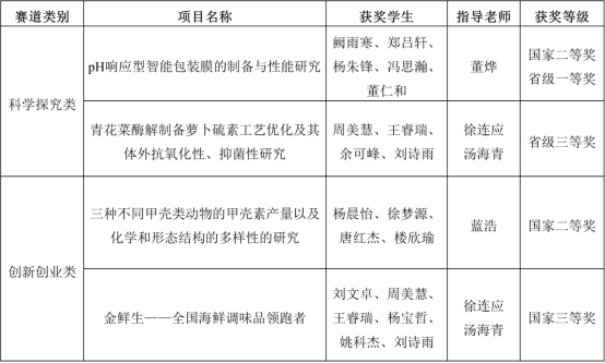 由徐连应和汤海青老师指导,刘文卓、周美慧、王睿瑞、杨宝哲、姚科杰、刘诗雨参与的项目《金鲜生——全国海鲜调味品领跑者》荣获创业组国家三等奖。