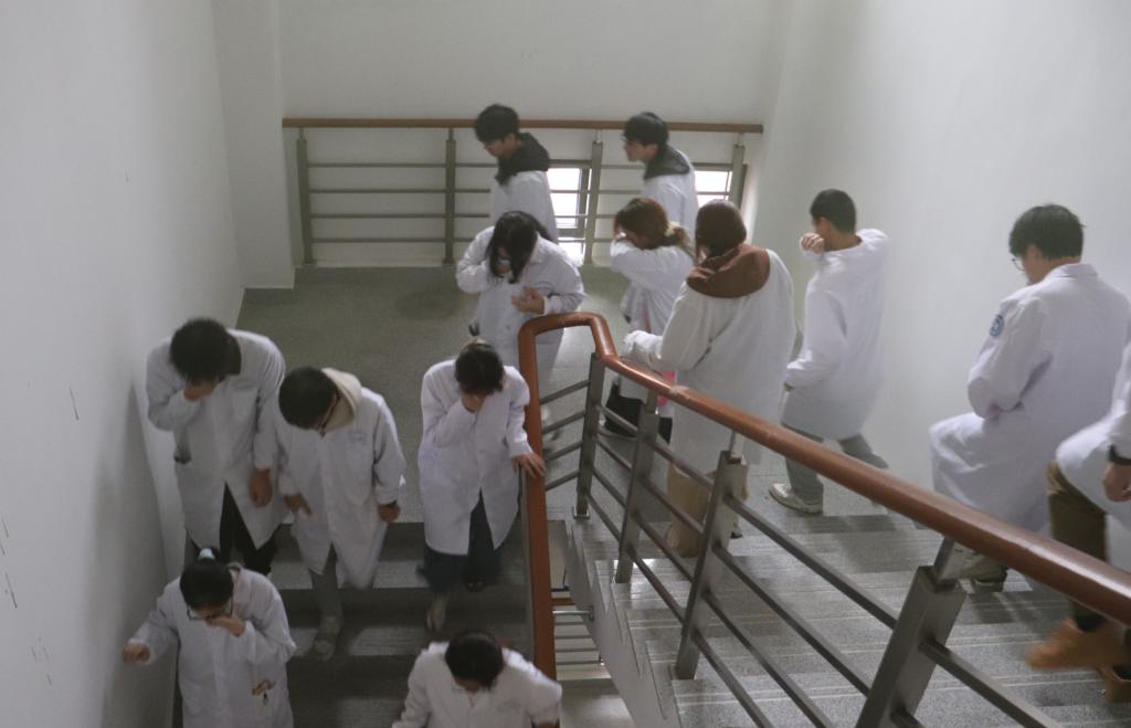 演练开始前,陈坚书记面向全体员工作浙江省5A等级平安校园建设动员讲话,要求全体师生在思想和行动上高度重视平安校园创建的目的和意义,就校园报警、宿舍用电安全、卫生状况等重要指标作出明确要求,坚决杜绝不安全因素。马学名副处长系统讲解了实验室演练的核心要求与现场纪律,强调必须严格服从指挥、遵守实验室安全规范,并详细说明“湿毛巾捂口鼻、低姿弯腰行进”等关键逃生要领。徐晏老师则就实验室日常管理规范、紧急状况下通道喷淋设备的使用方法等进行了系统介绍。周密的前期部署为演练顺利推进奠定了坚实基础。