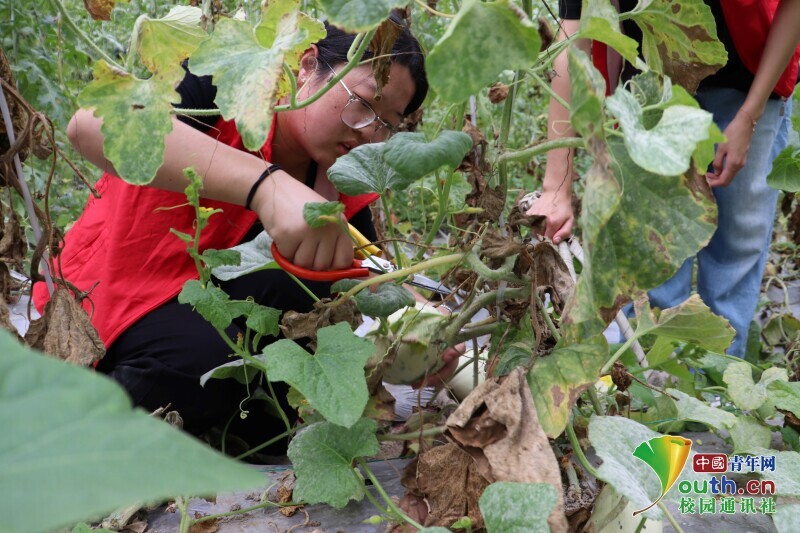 图为实践队员在合作社瓜果大棚里协助采摘。中国青年网通讯员 傅育梁 供图
