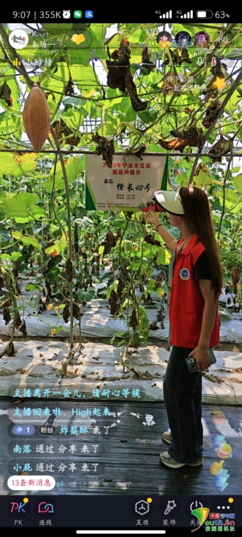 图为实践队员在抖音平台直播介绍绿苑合作社的果蔬。中国青年网通讯员 傅育梁 供图